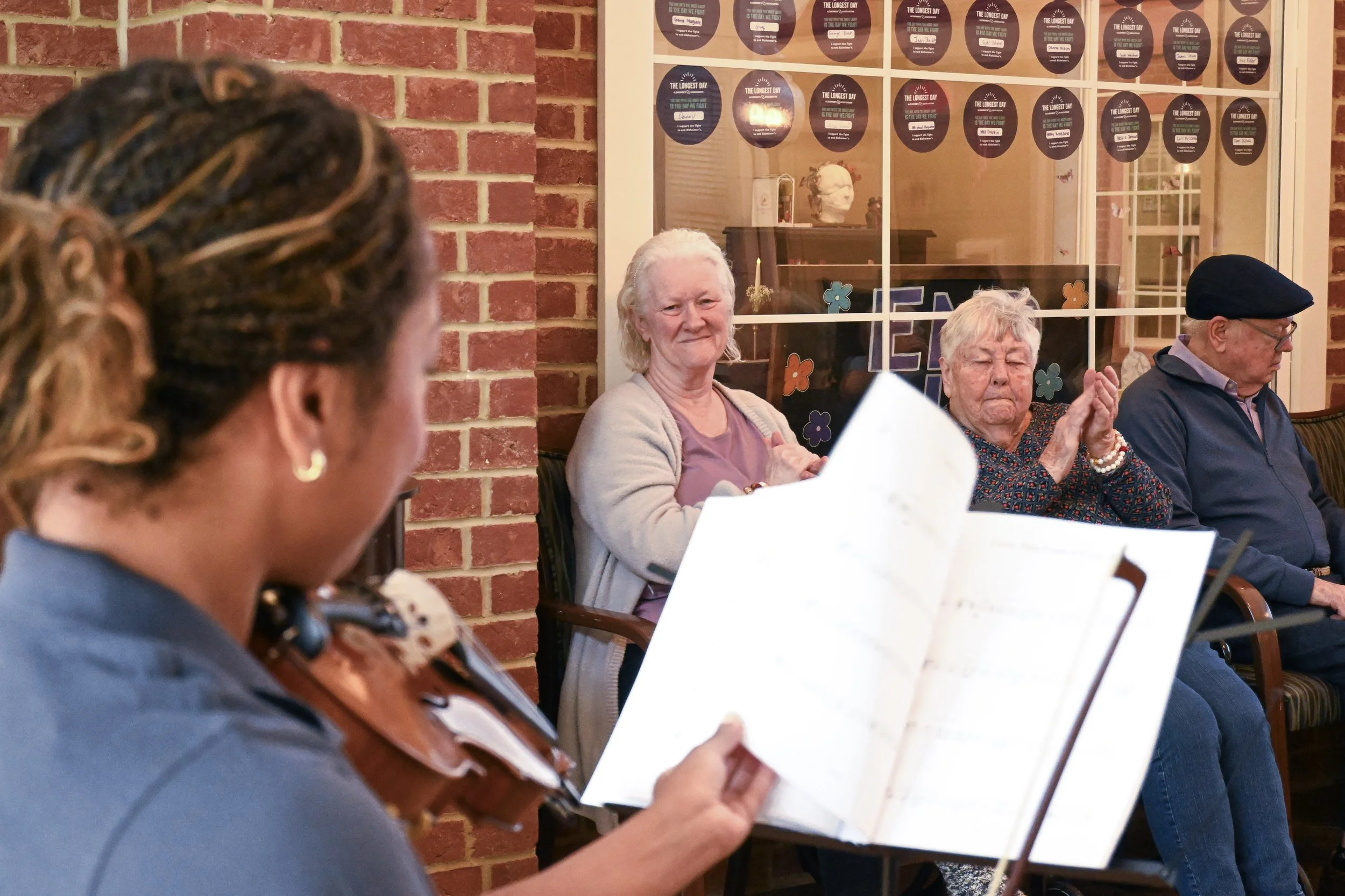 Live violin music can bring a special kind of warmth and beauty to a senior care setting. The gentle, expressive sound of the violin has a way of touching the heart—sometimes stirring fond memories, other times simply offering a moment of calm. For some residents, familiar tunes may spark conversation or smiles; for others, the music may provide quiet comfort and ease. Whether filling the room with joyful melodies or soft, soothing notes, the violin creates an atmosphere where connection feels natural and spirits are gently lifted. In this way, music becomes more than a performance—it’s a shared experience that can add depth and meaning to daily life.